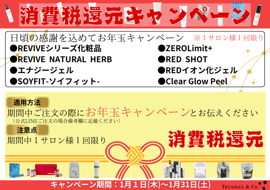 【2026年1月限定】過去最大級!新春超BIGキャンペーン開催のお知らせ2026年の幕開けとともに、日頃のご愛顧に感謝を込めて、過去最大級の「新春超BIGキャンペーン」を開催いたします!サロン様の飛躍を全力で応援する、1ヶ月限定の特別企画です。この機会にぜひ、人気商品や最新機器の導入をご検討ください。 キャンペーン期間2026年1月1日(木) ~ 1月31日(土) 人気商品【消費税還元】キャンペーン対象の人気商品を、実質消費税分OFFでお得に仕入れられるチャンスです!【対象アイテム】REVIVEシリーズ化粧品REVIVE NATURAL HERBエナジージェルSOYFITZEROLimit+RED SHOTREDイオンジェル(※現在入荷待ち)Clear Glow Peel【お申し込みルール】 ※1サロン様につき1回限りとなります。 公式LINE注文: 備考欄に「お年玉キャンペーン」または「消費税還元」と入力してください。 2⃣ 超スペシャル!アンチエイジングセット徹底的なエイジングケアを叶える3点セットに、なんと「UVクリーム現品(5,500円相当)」を1本お付けします!【セット内容】インテンシブホワイト(20g)VCP12エッセンス(50ml)アクティブ3A(30g)🎁特典:UVクリーム 30g(現品)をプレゼント!【お申し込みルール】 ※何セットでもご購入いただけます。 ※ハーブ未導入のサロン様でもご購入可能です。 3⃣ エアプラX × REDショット 最強タッグセット【10台限定】最強の美肌・痩身コンビを、新春だけの「ぽっきり価格」でご提供!特別セット価格:198,000円(税込)限定数:10セット限り 4⃣【限定1件】新型キャビゼロ フルオプションさらに、究極の目玉企画として「新型キャビゼロ」のフルセットを驚愕の特別条件でご用意しました。特別価格:1,000,000円(税込)限定数:1件のみ※詳細は公式LINEにてお早めにお問い合わせください。 5⃣【限定1件】サロン開業フルセットこれから開業される方、一気に設備をリニューアルしたい方へ。主力機器から商材まで全て揃う、夢のフルパッケージです。特別価格:2,200,000円(税込)限定数:1件のみ【セット内容】 新型キャビゼロフルセット、マジックハンド、エアプラX、カロニア、REVIVE NATURAL HERB、Clear Glow Peel、スキングロウクリーム、SOYFIT、ZEROLimit+ 2026年もサロン様がより一層輝く1年となりますよう、全力でサポートさせていただきます!