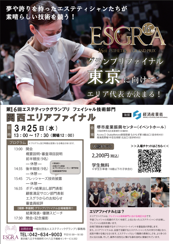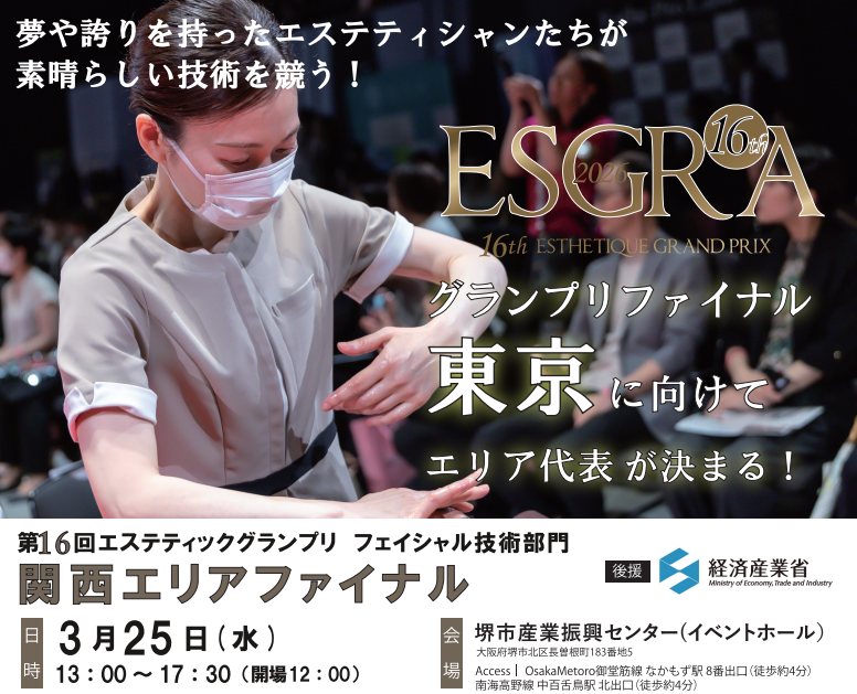 第16回エステティックグランプリ フェイシャル技術部門関西エリアファイナル が開催されます 弊社は、エステティック業界の価値向上を目的とした活動を行う 「エステティックグランプリ」に協賛しております。 その活動の一環として、2026年3月25日(水)には関西エリアの代表を決める「エステティックグランプリ 関西エリアファイナル」が開催されます。 各サロンを代表するエステティシャンが集い、技術や接客、お客様満足への想いを体現する場として、多くの関係者から注目されています。 弊社は、日々お客様と真摯に向き合いながら技術やサービスの向上に取り組むエステティシャンの皆様を応援しております。また、エステティック業界のさらなる発展に貢献したいという想いから、エステティックグランプリの活動に協賛しております。 今後も美容業界に関わる企業として、サロン様やエステティシャンの皆様の成長と業界全体の価値向上に寄与できる取り組みを続けてまいります。 <イベント概要> • イベント名: 関西エリアファイナル2026 • 開催期間: 2026年3月25日(水) • 時間: 13:00 – 17:30 (開場12:00)• 会場: 堺市産業振興センター(イベントホール) ・webチケットは、来場者1名につき、1枚必要です。 申込み後にメールで送られるwebチケットを当日の受付でご掲示ください。・チケットご購入後は、大会の延期・中止以外の理由に伴う払い戻しはできません。 詳細はコチラ(外部サイト)