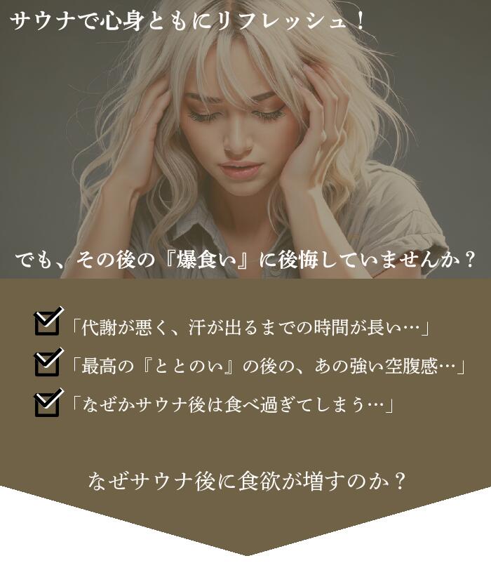 そんなお悩みはありませんか?「サウナプラス」は、サウナ後の高まった食欲を穏やかにコントロールし、健康的で充実したサウナライフを送るためのサプリメントです。
