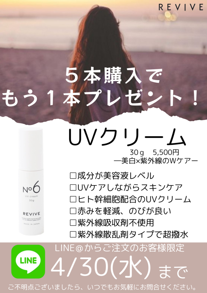 4月1日(火)~30日(水)までの期間中、UVクリーム5本購入で1本プラスでプレゼント!!今からのこの季節必須なUVクリームを是非この機会にいかがでしょうか。