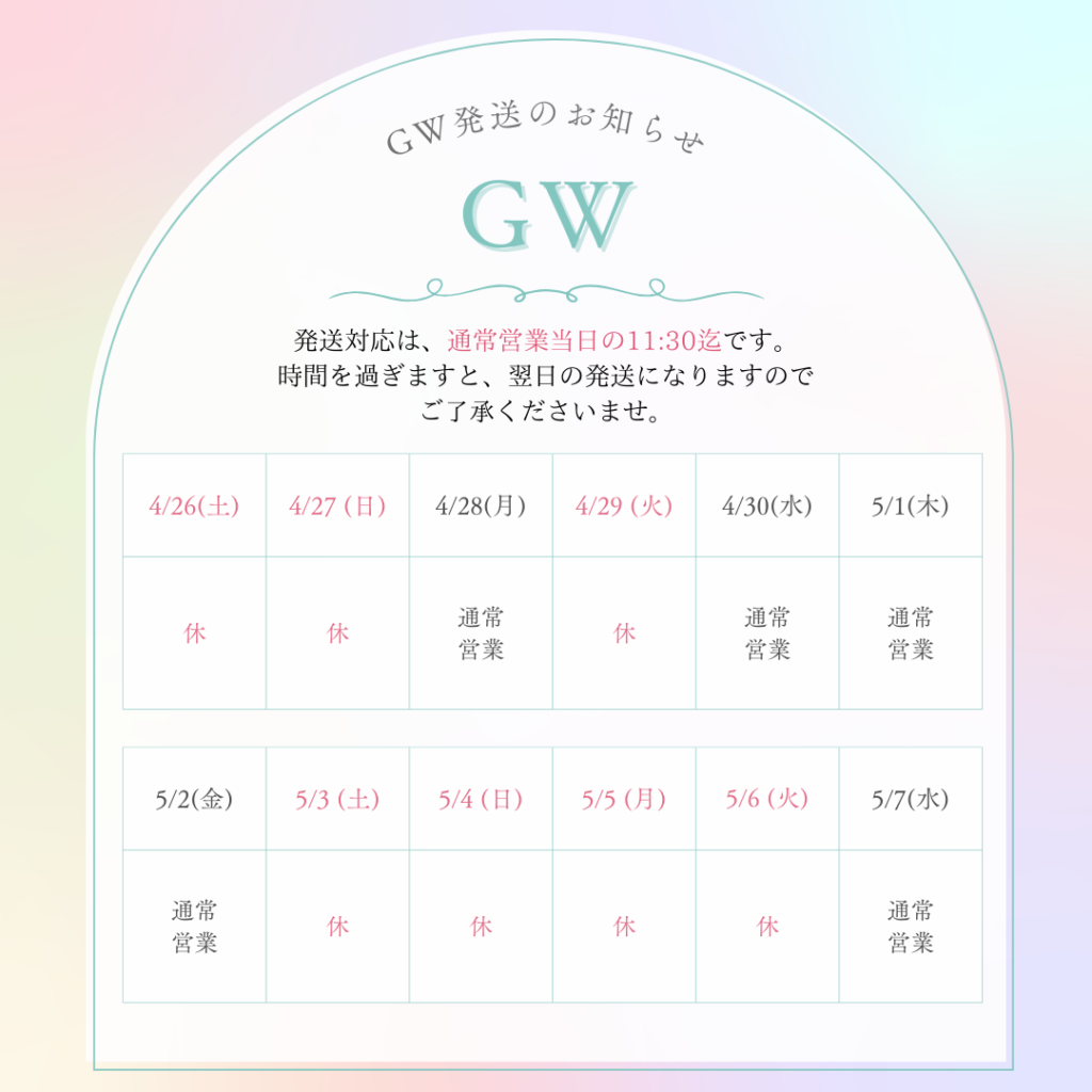 4月28日(月)11:30以降、4月29日(火)終日、4月30日(水)11:30までに頂きましたご注文は、4月30日(水)中に順次ご対応させていただきます。