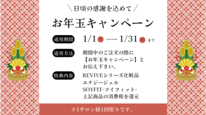 お年玉キャンペーン!! 今年も弊社をご愛顧いただき、 誠にありがとうございます。 来年もさらなるサービス向上に向け、 気持ちを新たに取り組んでまいりますので、 お気付きのことは何なりとご指導いただければ幸いです。 変わらぬご愛顧のほど心よりお願い申し上げます お年玉キャンペーン!! 日頃の感謝の気持ちを込めまして、 1月の注文の際に【お年玉キャンペーン】と お伝えいただきますと REVIVEシリーズ化粧品・エナジージェル・SOYFIT-ソイフィット- 上記商品の消費税を還元とさせていただきます。 ※1サロン様1回限り 期間は、1月31日までとなっております。 本年もご満足いただけるサービスを心がけてまいります。 どうぞよろしくお願いいたします。 営業開始は1月5日からとさせていただきます。