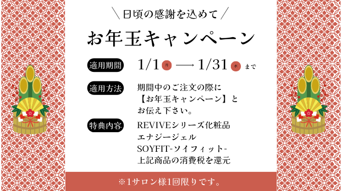 お年玉キャンペーン!! 今年も弊社をご愛顧いただき、 誠にありがとうございます。 来年もさらなるサービス向上に向け、 気持ちを新たに取り組んでまいりますので、 お気付きのことは何なりとご指導いただければ幸いです。 変わらぬご愛顧のほど心よりお願い申し上げます お年玉キャンペーン!! 日頃の感謝の気持ちを込めまして、 1月の注文の際に【お年玉キャンペーン】と お伝えいただきますと REVIVEシリーズ化粧品・エナジージェル・SOYFIT-ソイフィット- 上記商品の消費税を還元とさせていただきます。 ※1サロン様1回限り 期間は、1月31日までとなっております。 本年もご満足いただけるサービスを心がけてまいります。 どうぞよろしくお願いいたします。 営業開始は1月5日からとさせていただきます。