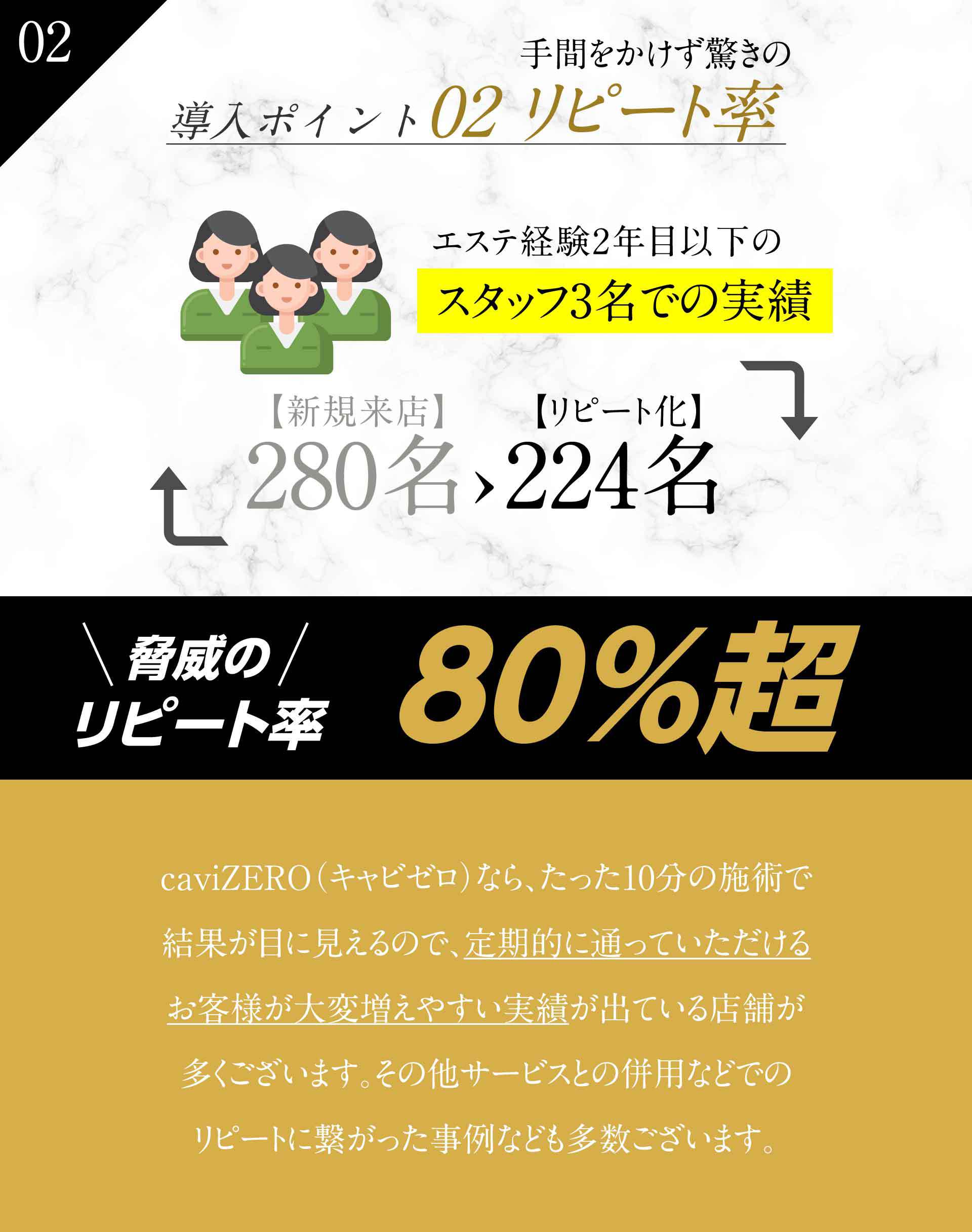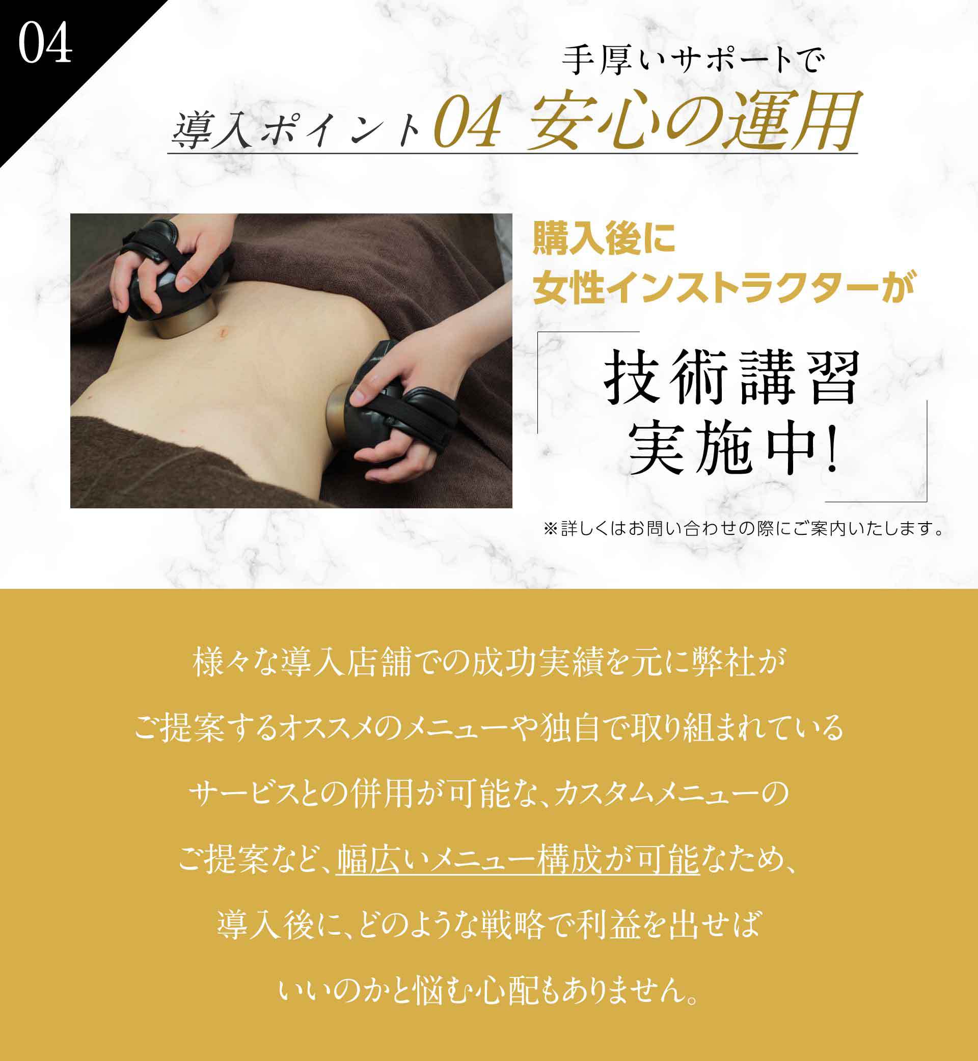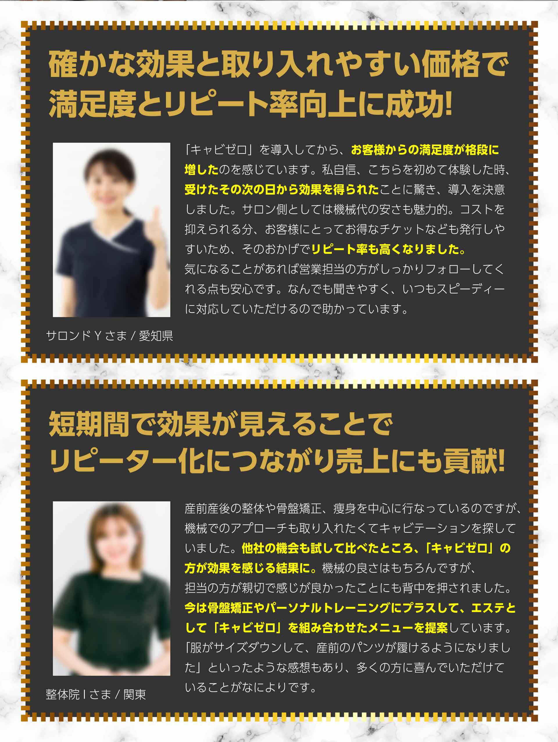 A.老廃物を排出するため、しっかり水分をとることをおススメしてください。また、施術直後は消化吸収がよくなるので、2時間は食事を控えてもらうよう案内してください。キャビテーションの効果は2~3日継続しますので、軽いストレッチや食事制限をすることにより更なる効果が得られます。