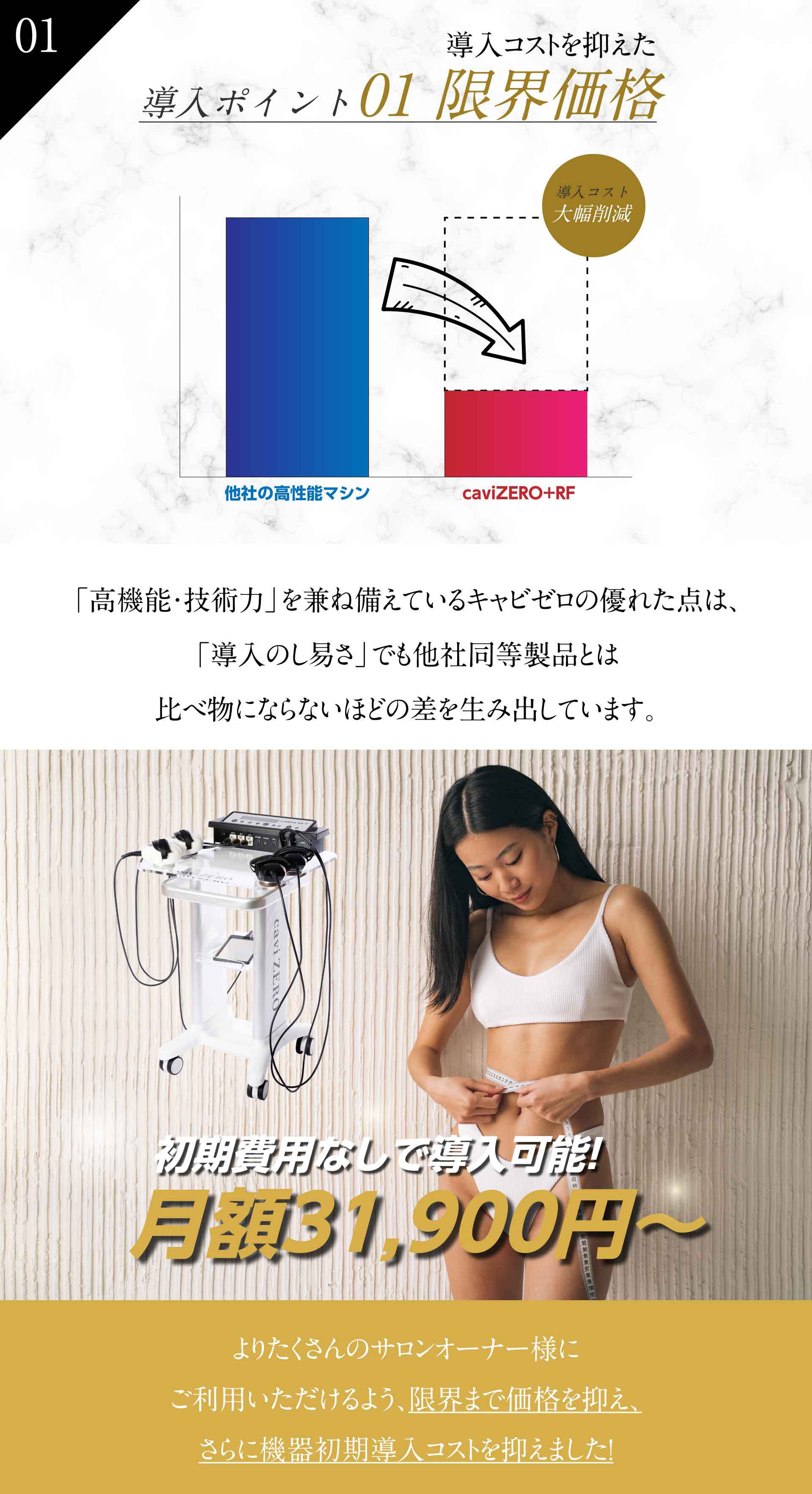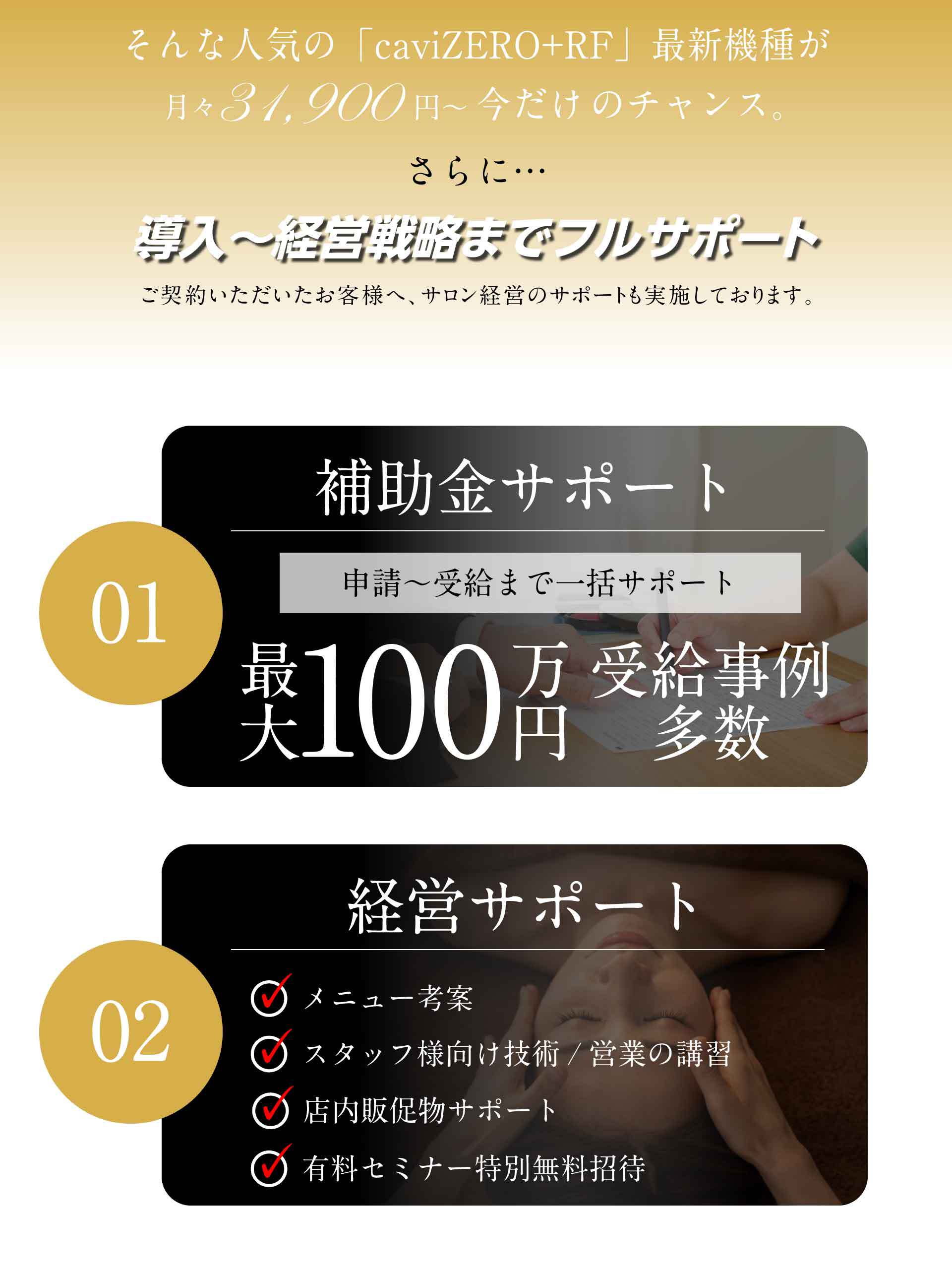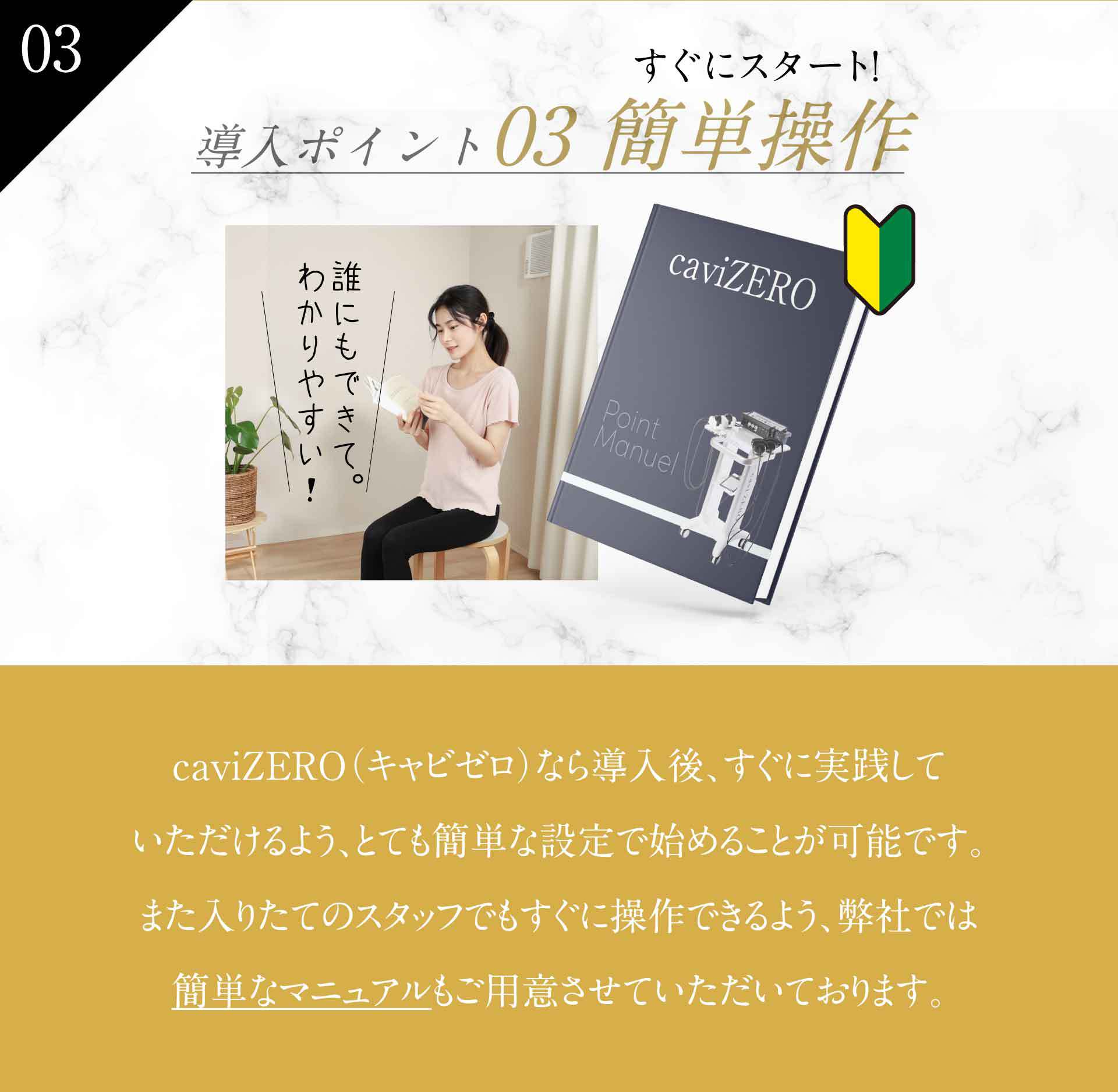 A.老廃物を排出するため、しっかり水分をとることをおススメしてください。また、施術直後は消化吸収がよくなるので、2時間は食事を控えてもらうよう案内してください。キャビテーションの効果は2~3日継続しますので、軽いストレッチや食事制限をすることにより更なる効果が得られます。