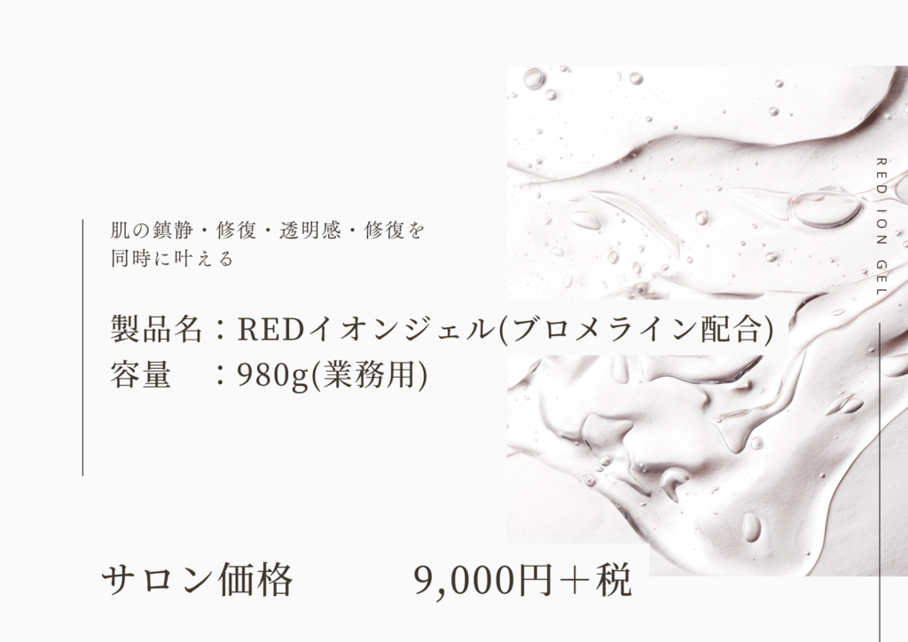 「導入するたび、脂肪溶解。浸透・鎮静・修復をこの1本に・・」韓国美容×サロン専用処方。DNA × CICA × ブロメライン 肌の“鎮静・透明・修復”を同時に叶える。 REDイオン導入ジェル、誕生。“鎮静・透明・修復”すべて、この1本に。 ・韓国美容科学フォーミュラ ・サーモンDNA × CICA複合体 ・ブロメライン(パイナップル酵素)配合 ・イオン導入対応・高導入処方